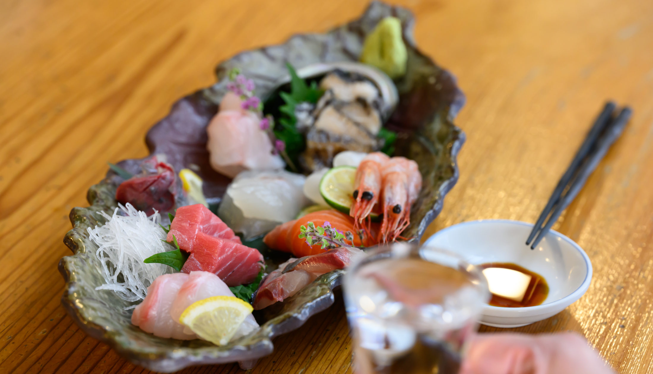 The quality speaks for itself in the magnificent sashimi platter for two (¥3,200), featuring ten daily selections such as live abalone, freshly-prepared gure (grunt fish), wild kanpachi (yellowtail), and sweet raw amaebi (shrimp)—an impressive spread that showcases the restaurant’s commitment to excellence. Even better, weekday happy hour runs from opening until 5 PM, with both sake and draft beer priced at just ¥330. The generous lunch-only menu adds further appeal, offering everything from seafood bowls and udon to maguro yamakake (tuna with grated mountain yam).