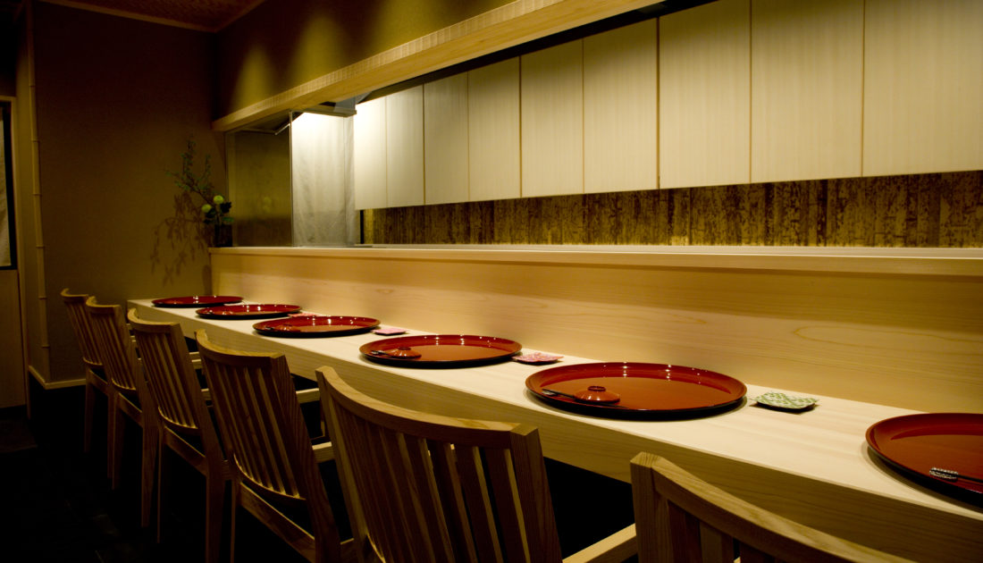 京都・祇園、八坂神社のほど近く。檜の一枚板で仕立てられたカウンターが静かに迎えるのは、一日一組の客だけをもてなす、六席のみの特別な空間。